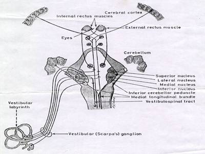 شكل رقم (5 ): الفرع التوازني للعصب الثامن وارتباطاته المتعددة في الدماغ وجذعه والجهاز المنشط الشبكي